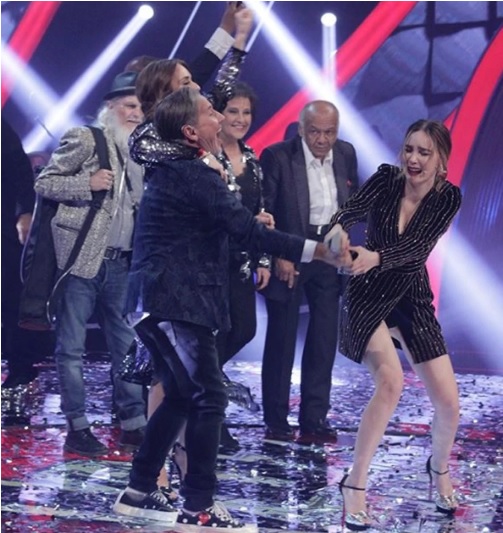 Todo sucedió en al final del programa La Voz Senior que fue ganado por el venezolano Ricardo Montaner y su equipo. Cuando le entregaron el respectivo trofeo, Belinda trató de arrabatárselo como parte de una broma y en el forcejeo se abrió el vestido de la cantante quien hasta ahora no ha comentado el incidente.