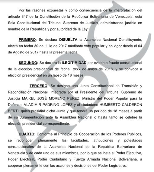 ABC tuvo acceso a un borrador de la supuesta sentencia de 16 páginas en la que se declararía disuelta la Asamblea Nacional Constituyente, «la ilegitimidad por evidente fraude constitucional de la elección presidencial del pasado 20 de mayo de 2018 y se designa en su tercer punto una Junta Constitucional de Transición y Reconciliación Nacional», integrada por los ya mencionados Maikel José Moreno Pérez, Vladimir Padrino López y el ciudadano Humberto Calderón Berti. Este borrador estuvo listo el día 12 de agosto y fue enviado a todas las partes involucradas por correo electrónico y física a través de sus emisarios. A Vladimir Padrino López, por ejemplo, se le entregó personalmente en el Círculo Militar de Caracas.