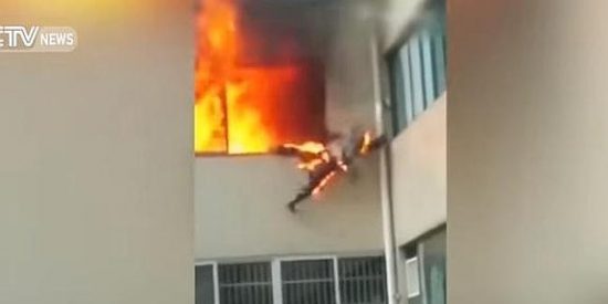 No le quedaba otra opción. El vídeo muestra la desesperación de un bombero chino que está atrapado por las llamas, después de salvar del fuego a los habitantes de un piso en el condado de Jianli , provincia de Hubei.